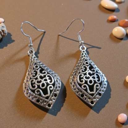 Laissez-vous séduire par ces boucles d’oreilles au style oriental chic, sublimées par de jolis motifs ajourés et un contraste argent/noir élégant