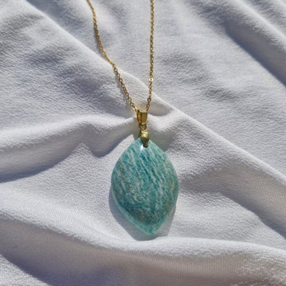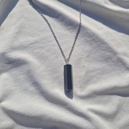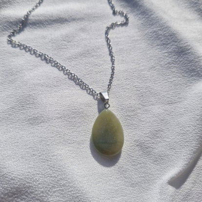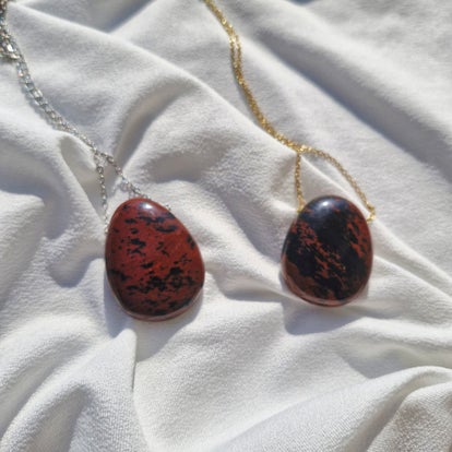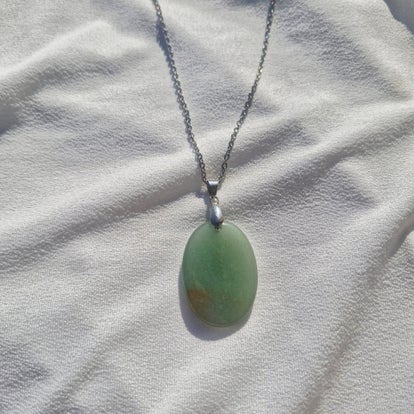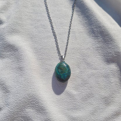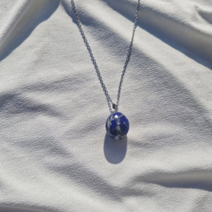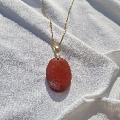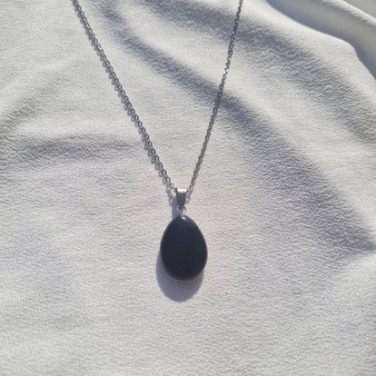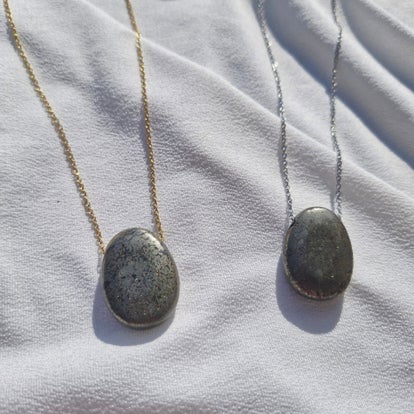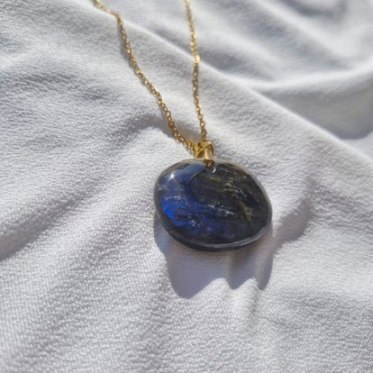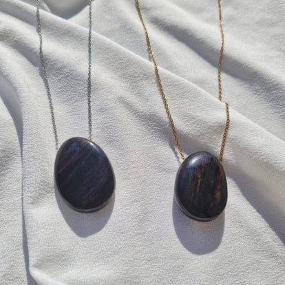 Sa pierre polie révèle de subtils reflets selon la lumière, faisant de chaque collier une pièce unique, à la fois discrète et puissante.