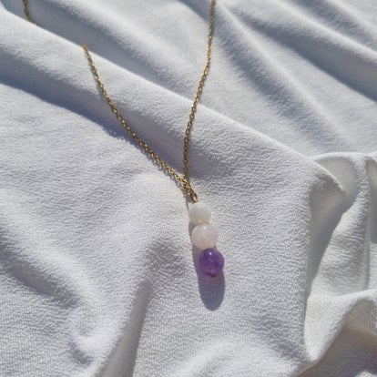 Son sertissage doré met en valeur les nuances violettes naturelles de la pierre, tandis que la chaîne en acier inoxydable doré assure durabilité et éclat au quotidien.