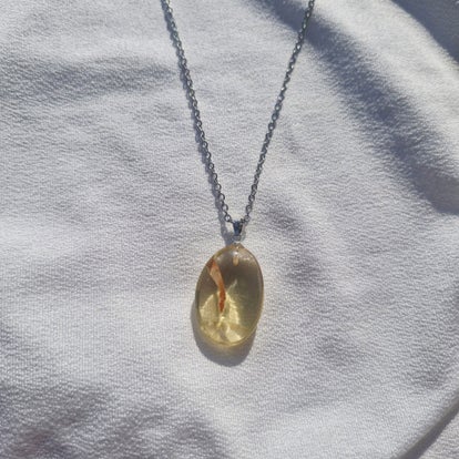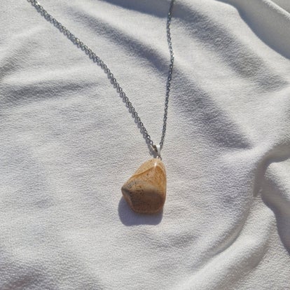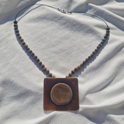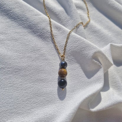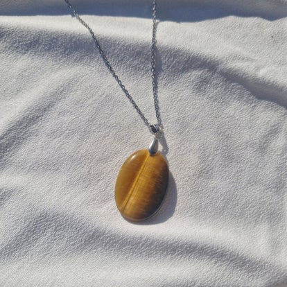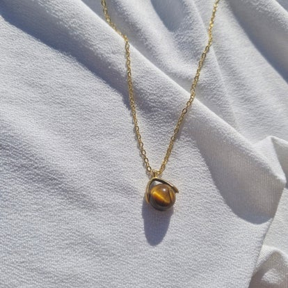 Ses reflets chauds et lumineux, aux nuances dorées et brunes, sont sublimés par un sertissage délicat et une chaîne en acier inoxydable doré, créant un bijou élégant et porteur de sens.