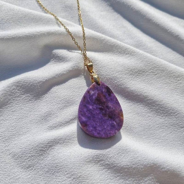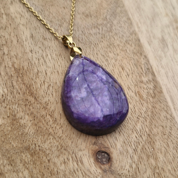 Ce collier met en valeur une magnifique Charoïte naturelle, pierre rare et spirituelle, montée sur une chaîne en acier inoxydable doré. Ses nuances violettes profondes et ses reflets tourbillonnants évoquent la transformation intérieure et la sagesse du cœur.