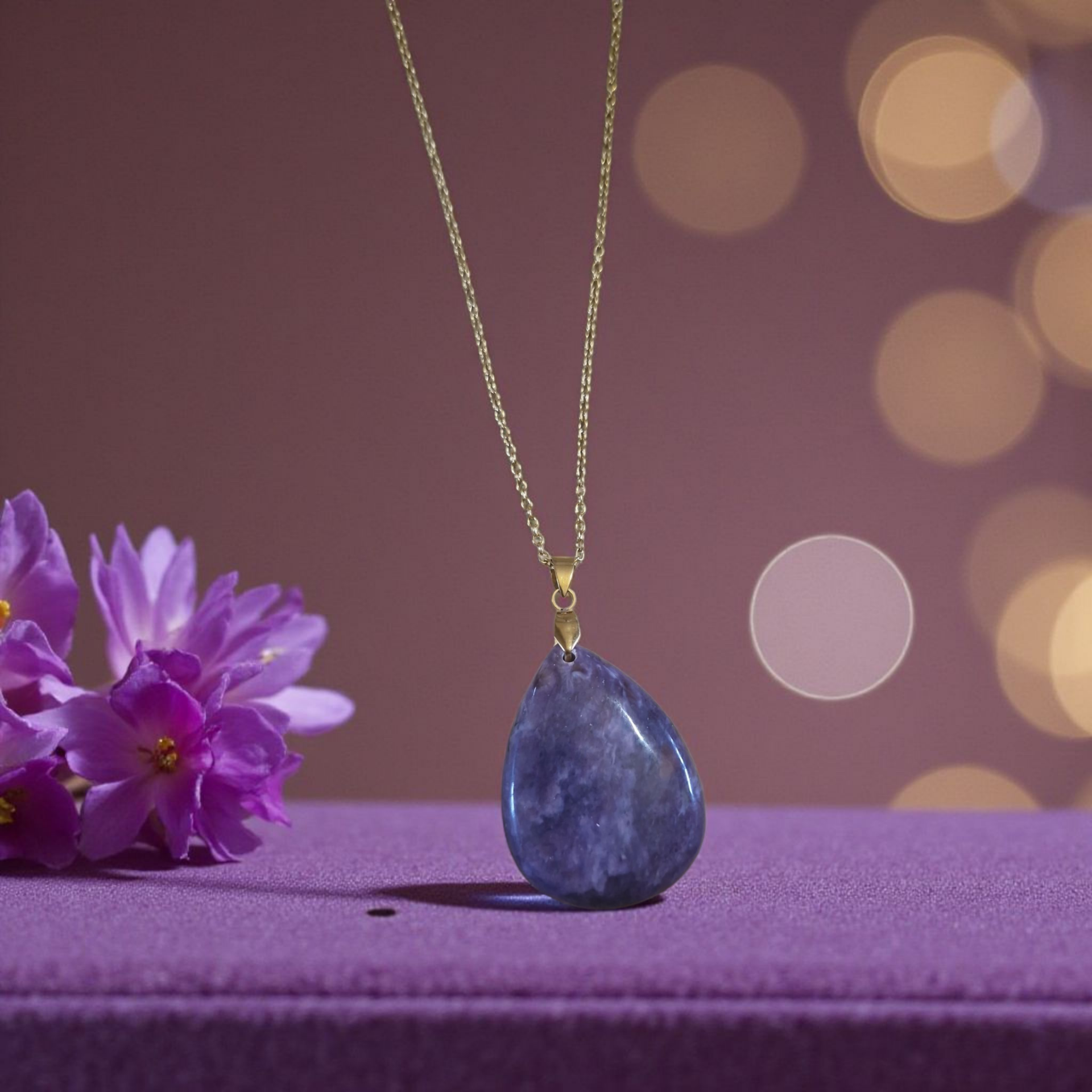 Chaque pierre est unique par ses volutes violettes et ses éclats soyeux, rendant chaque collier singulier et profondément spirituel.