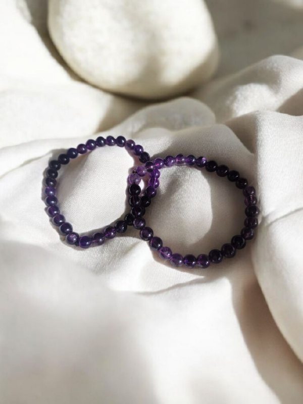 Chaque perle violette, aux reflets profonds, symbolise la paix intérieure et la sagesse spirituelle.