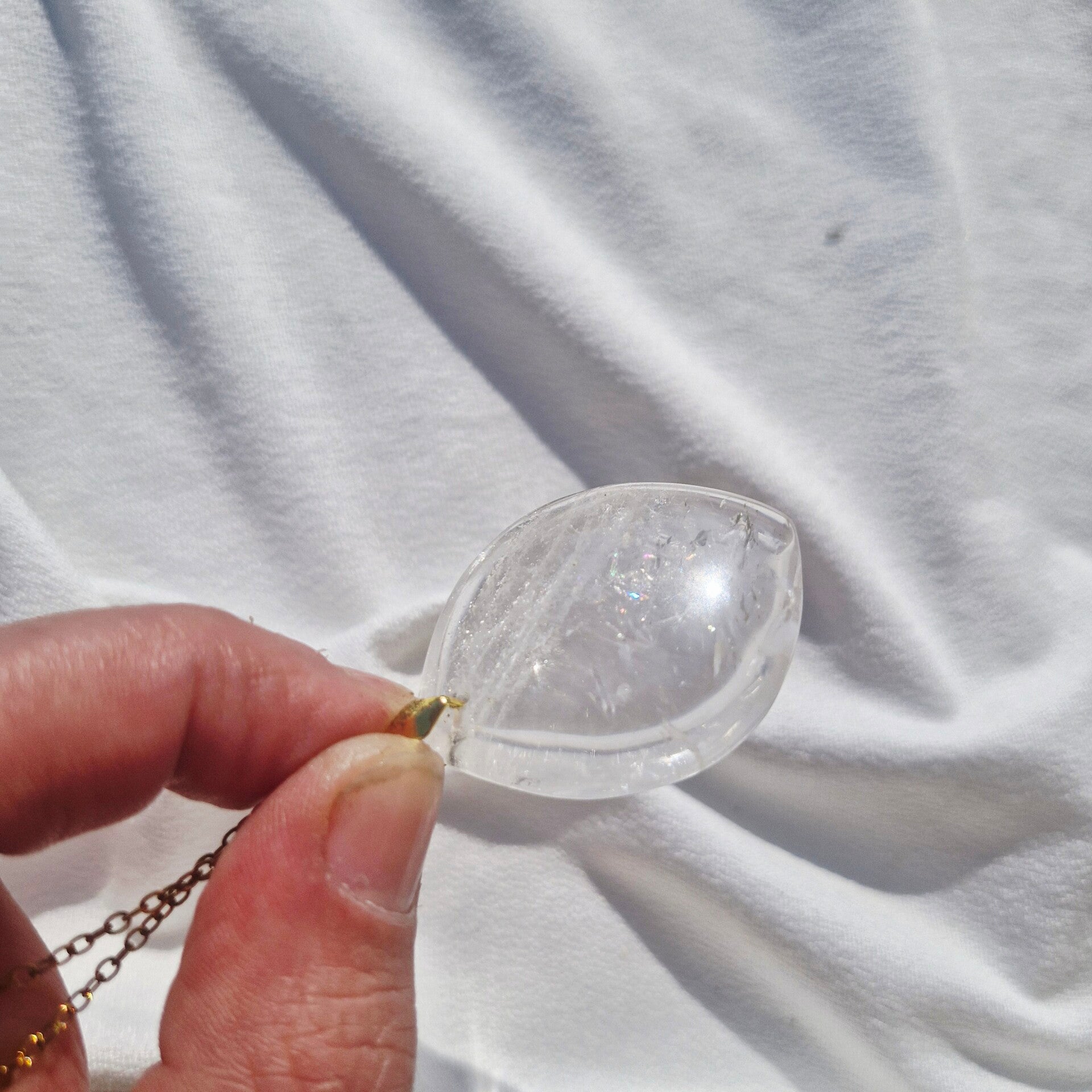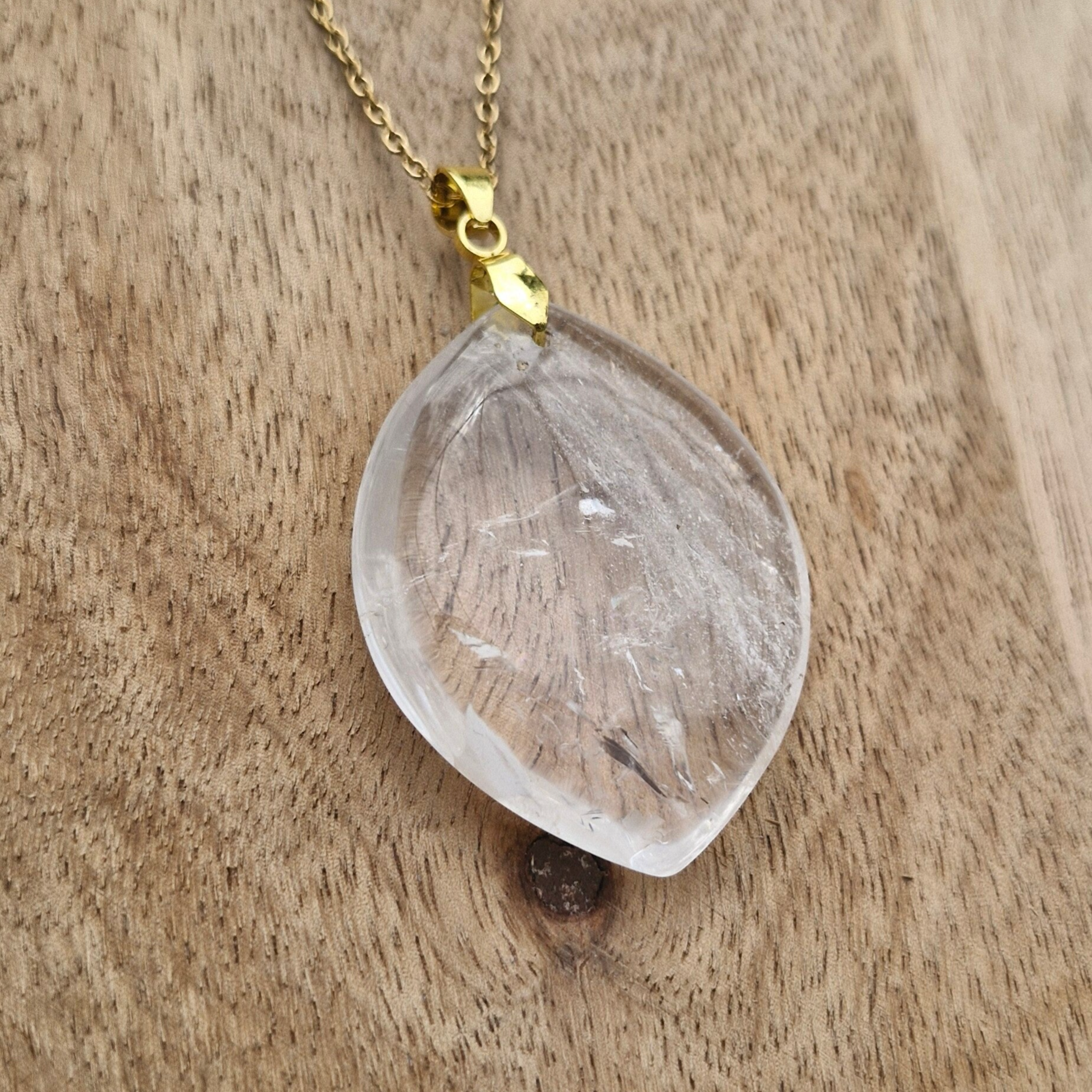 Chaque pendentif est unique, révélant des inclusions et reflets naturels qui font de chaque bijou une pièce authentique et lumineuse.