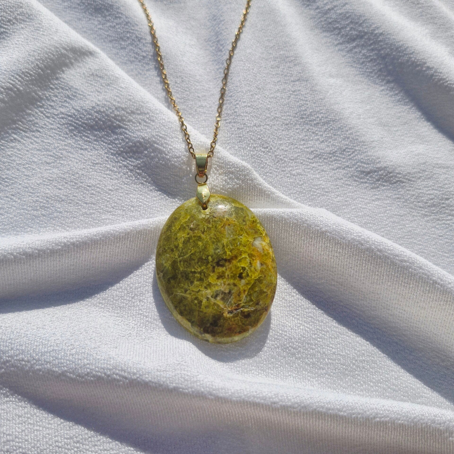 Ce collier met en lumière une splendide Opale Verte naturelle, pierre de renouveau et d’équilibre, montée sur une chaîne en acier inoxydable doré. Ses nuances vertes et dorées rappellent la vitalité de la nature et la régénération du cœur.