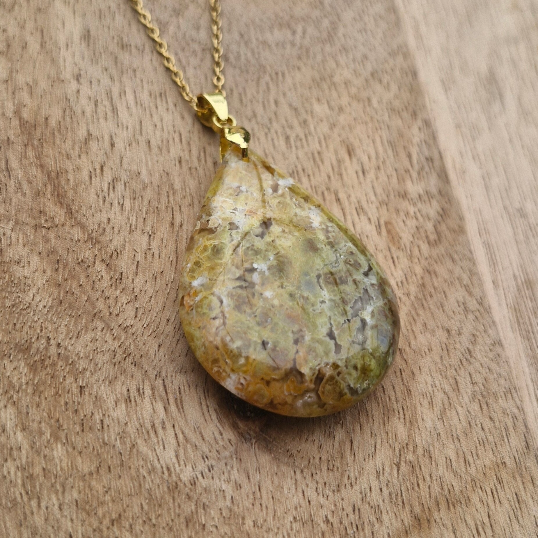 Chaque pierre est unique par ses motifs et ses reflets, faisant de chaque collier une création authentique et pleine de charme.