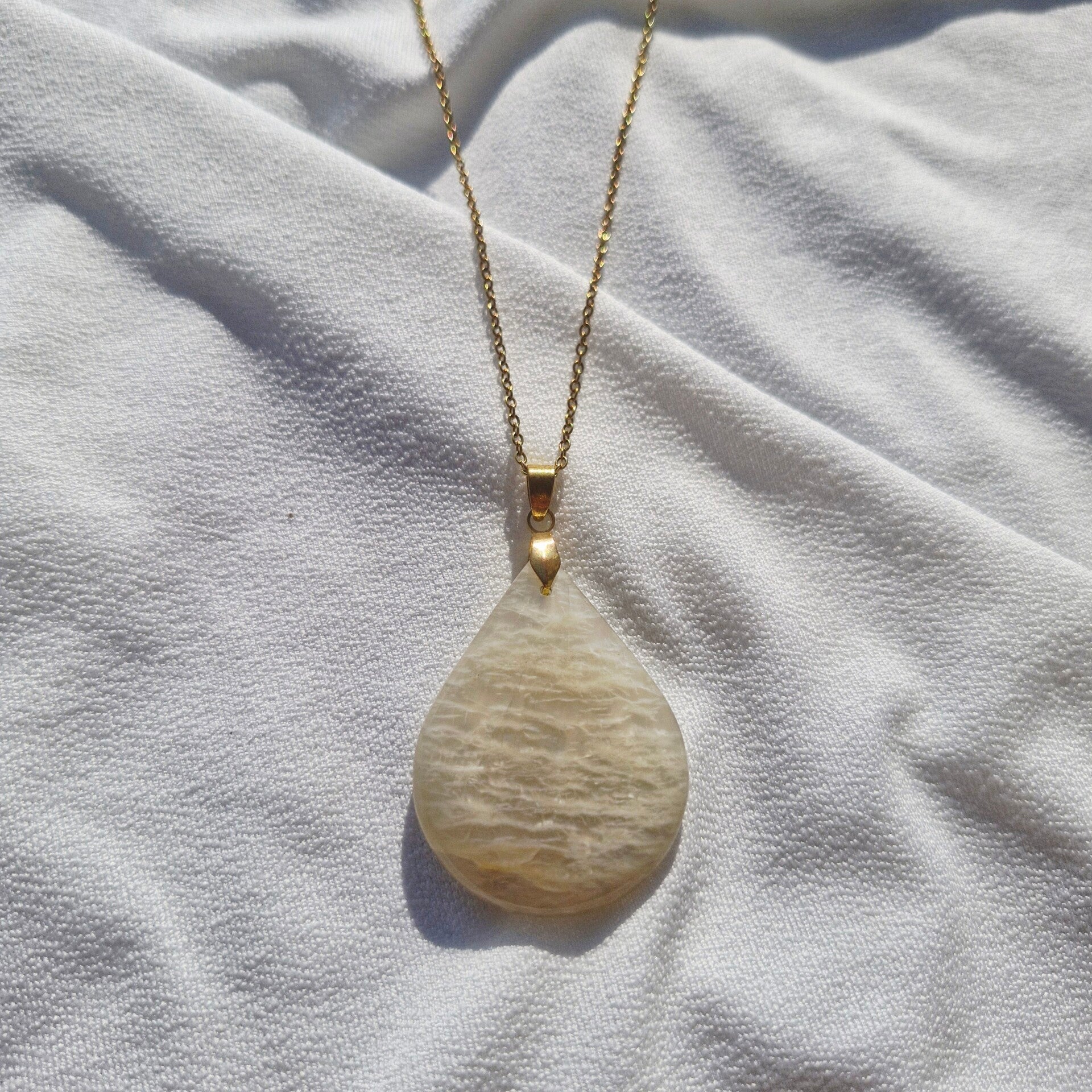Ce collier met en lumière une douce Pierre de Lune beige, pierre de féminité et d’intuition, montée sur une chaîne en acier inoxydable résistante et élégante. Ses reflets nacrés apportent une touche de douceur et de mystère à ce bijou intemporel.