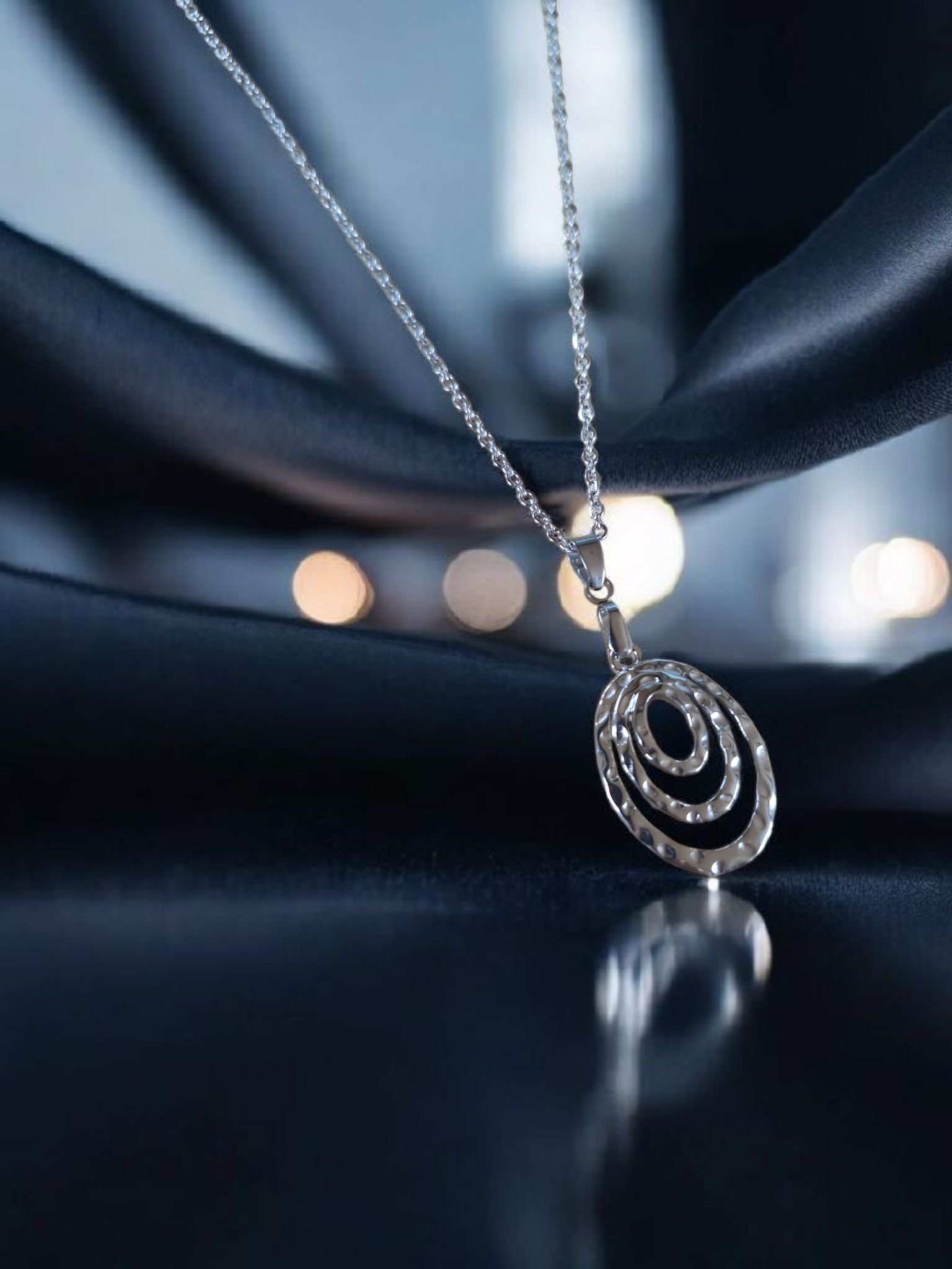 Élégant et moderne, ce collier en acier inoxydable argenté se distingue par son pendentif ajouré composé de cercles martelés. Son effet texturé capte la lumière et symbolise l’harmonie, l’unité et l’éternité.