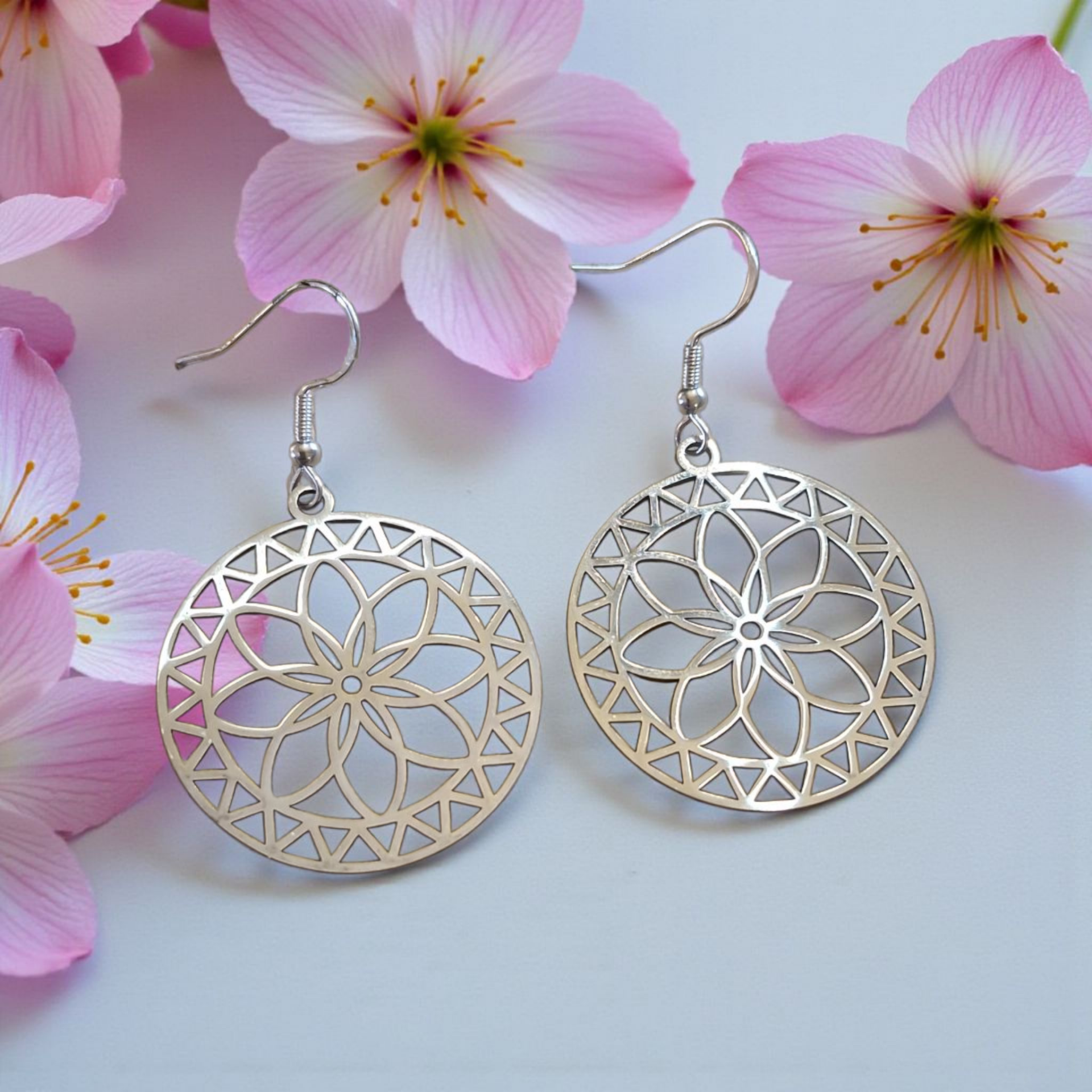 Ces boucles d’oreilles ajourées en argent 925 et acier inoxydable arborent un motif mandala, symbole d’unité, d’équilibre et de paix intérieure.