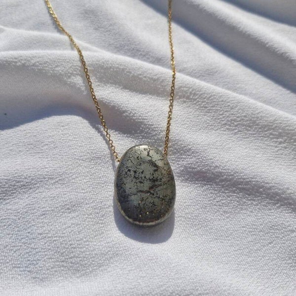Ce collier met en avant une superbe Pyrite, pierre de vitalité et d’abondance, montée sur une chaîne en acier inoxydable doré. Son éclat métallique doré évoque la force, la prospérité et la confiance en soi.