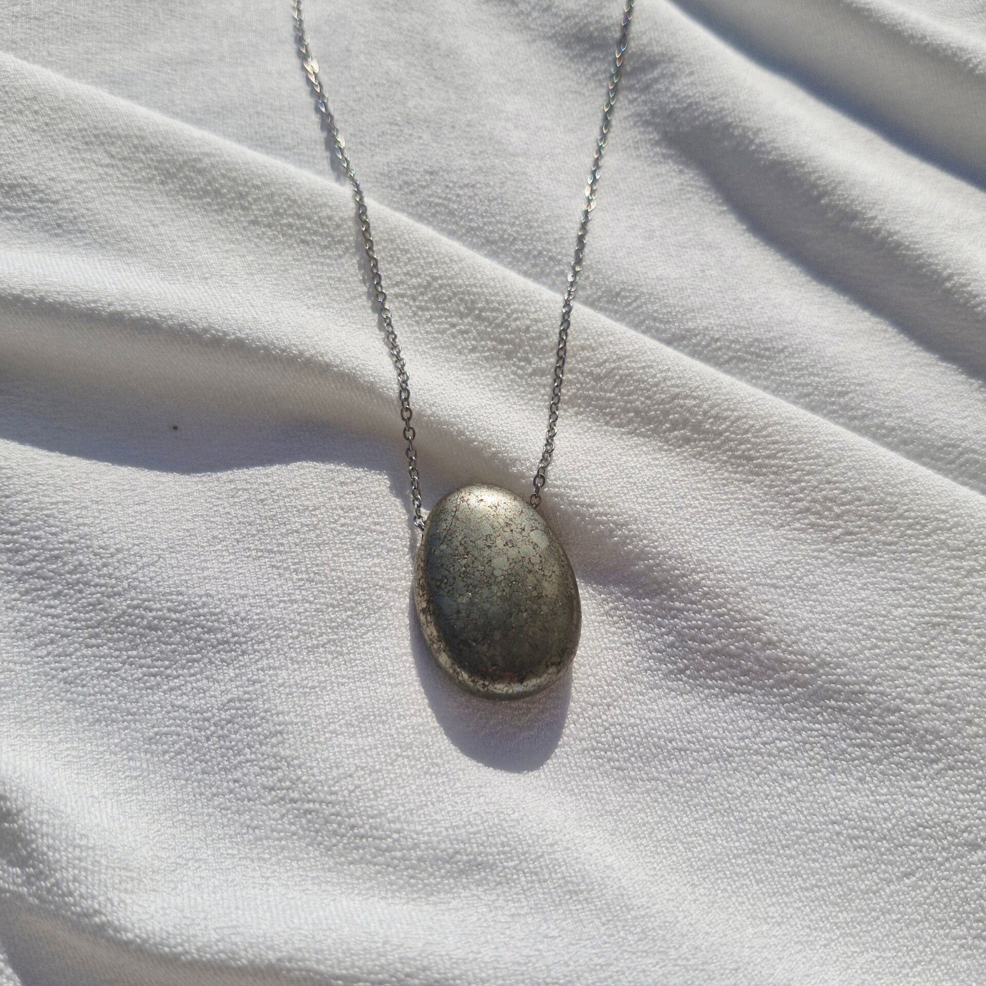 Chaque pierre est unique, révélant des reflets métalliques distincts qui font de chaque collier une création originale et rayonnante d’énergie positive.