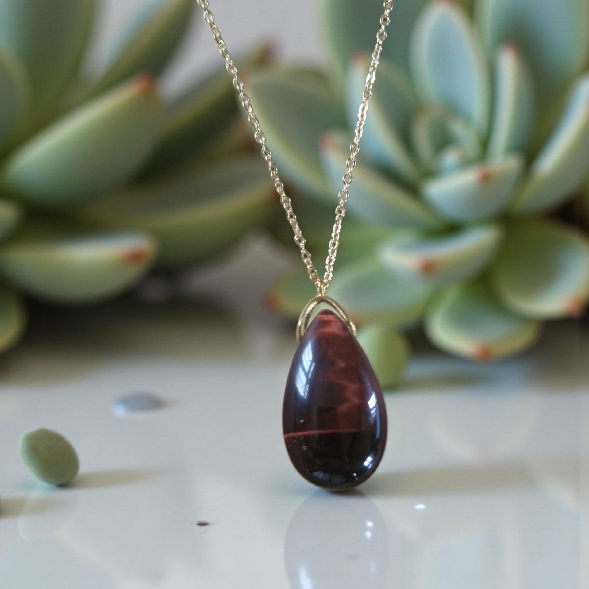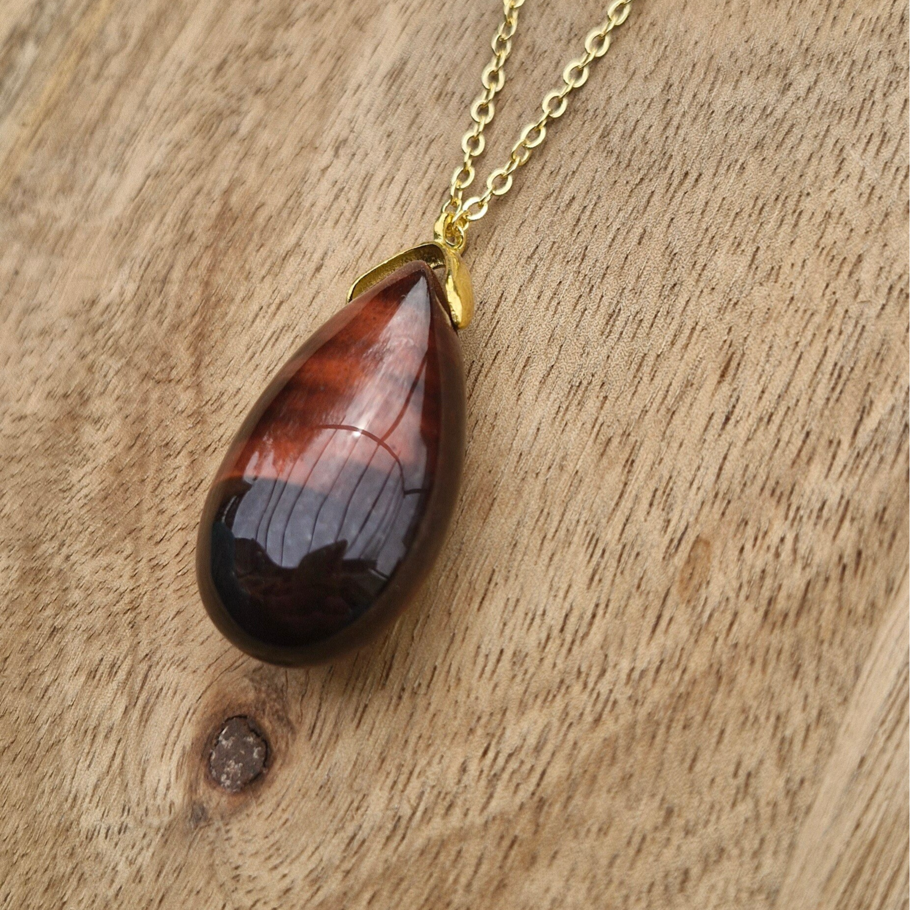 Ce collier met en valeur un superbe pendentif en Œil de Taureau, pierre de vitalité et de protection, montée sur une chaîne en acier inoxydable doré. Ses reflets rouges profonds symbolisent la force, la détermination et la confiance en soi.