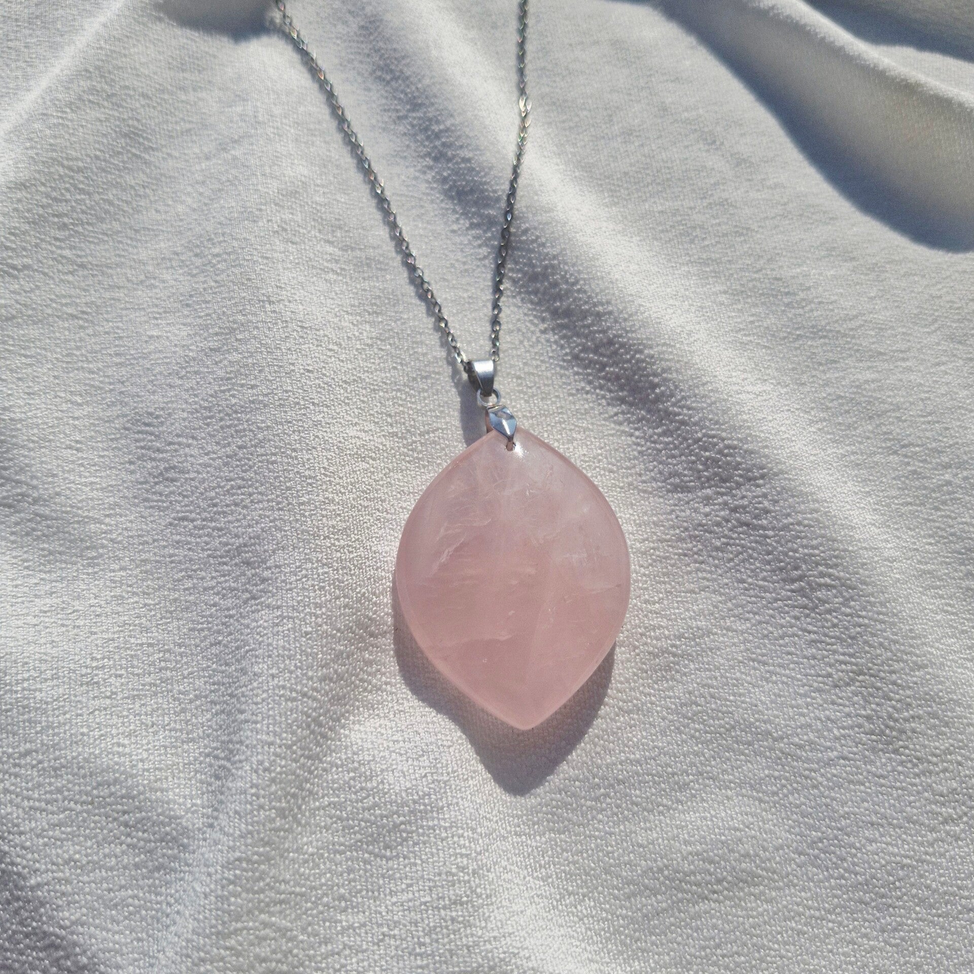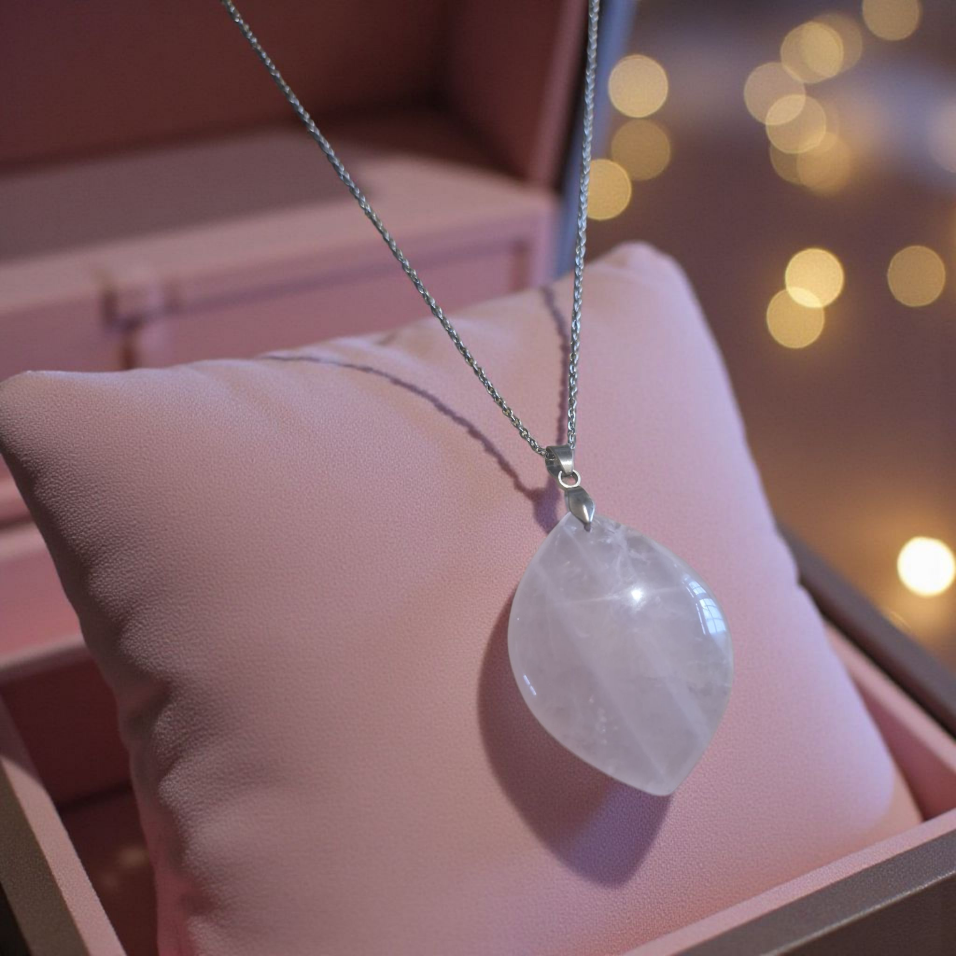 Ce collier en acier inoxydable met en valeur un magnifique pendentif en Quartz Rose, pierre symbole d’amour inconditionnel et de tendresse.