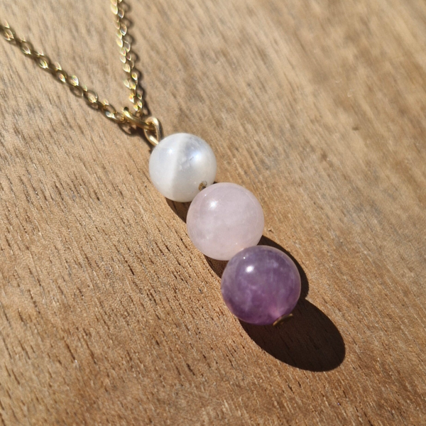 Un collier délicat et apaisant, alliant trois pierres naturelles symboles de sérénité, d’amour et d’intuition.