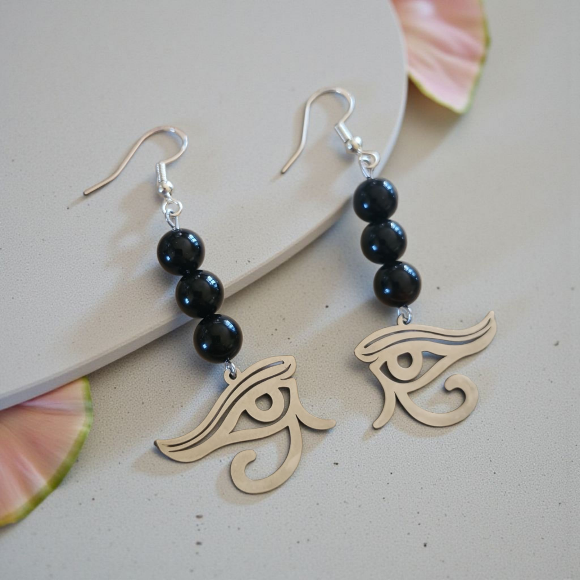 Boucles d’Oreilles Œil d’Horus & Tourmaline Noire – Protection & Énergie