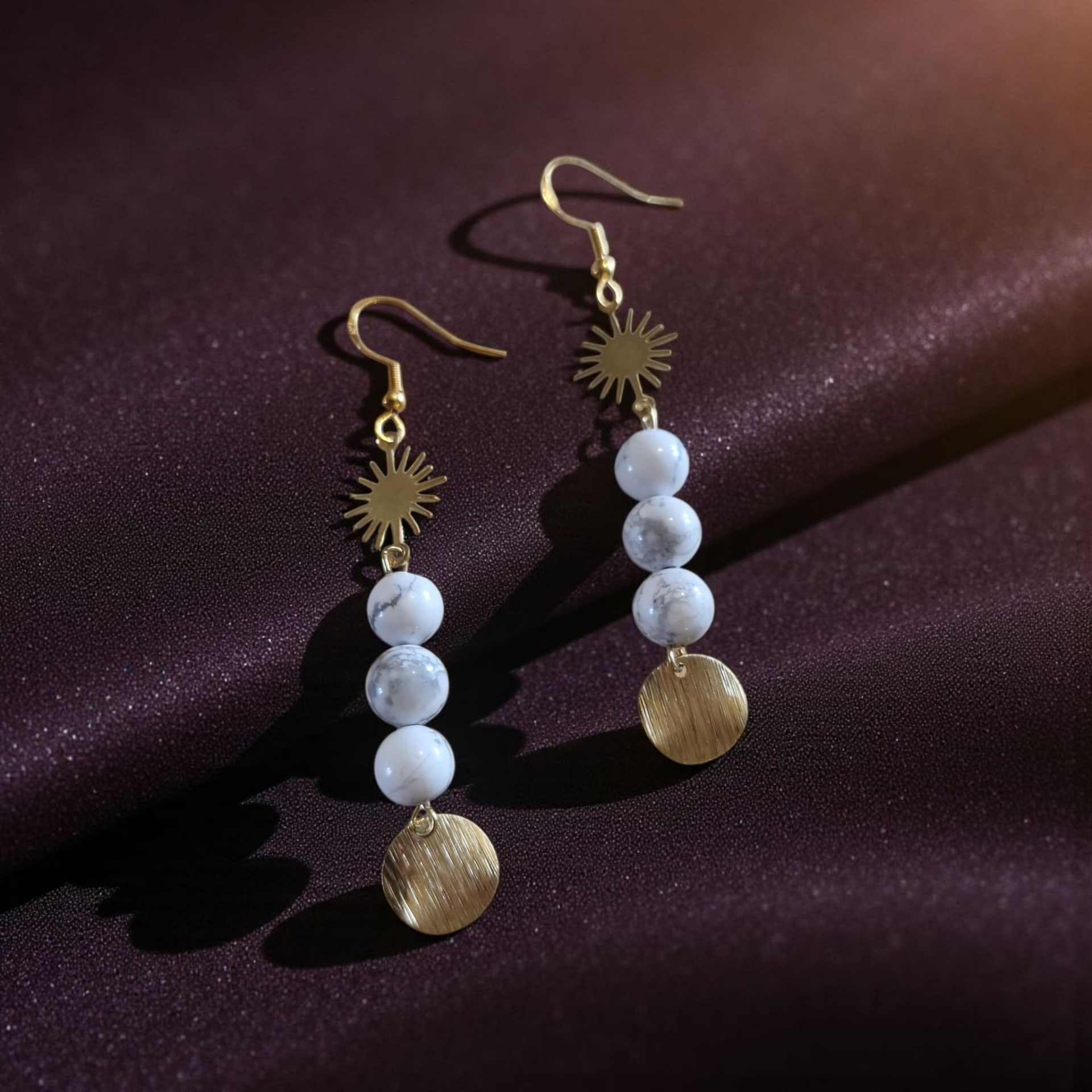 Boucles d’Oreilles Howlite Blanche & Soleil Doré – Sérénité & Clarté d’Esprit