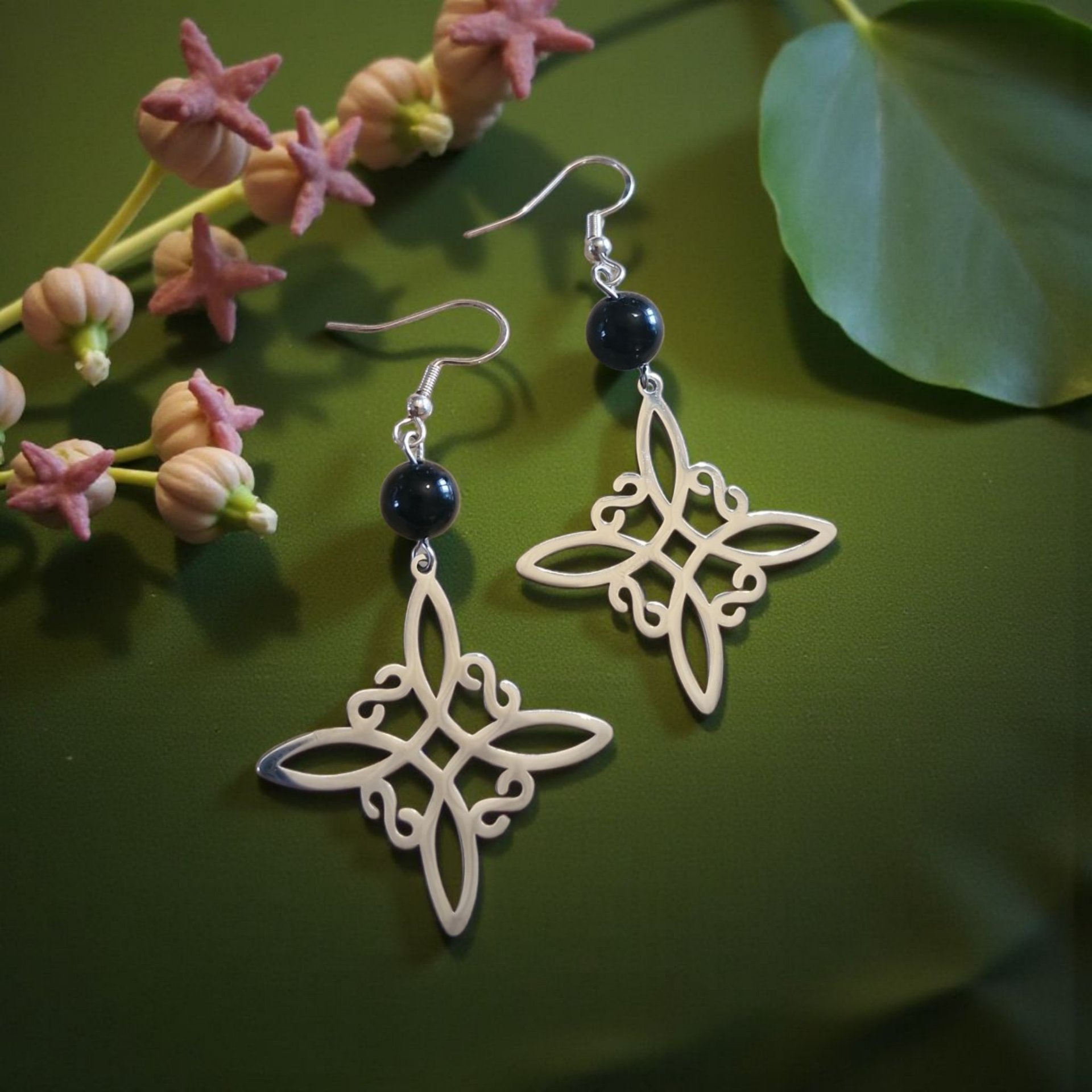 Ces boucles d’oreilles harmonieuses allient la protection énergétique de la tourmaline noire à la puissance symbolique du nœud wiccan.