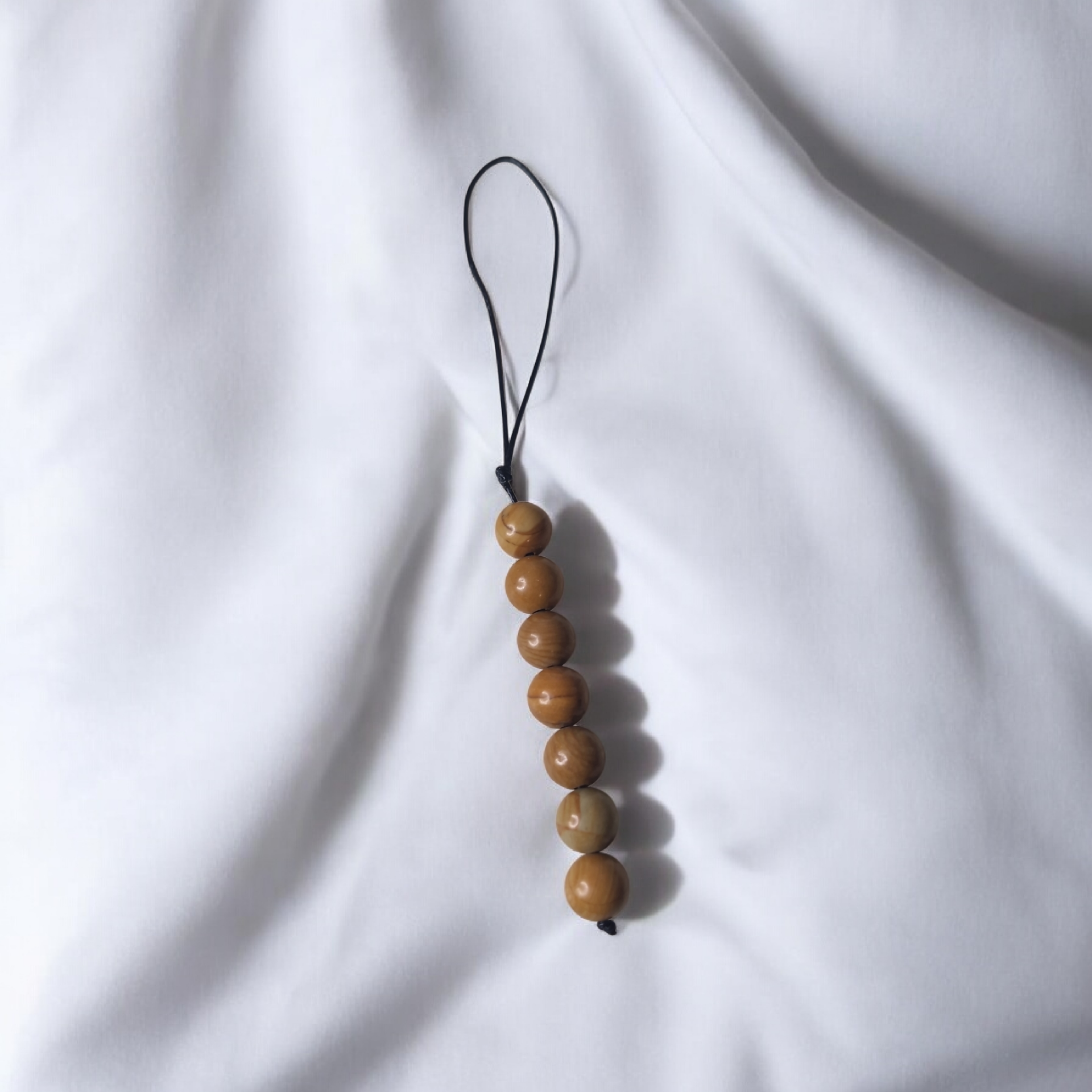 Ce bijou en bois fossile peut s’accrocher à votre téléphone, sac à main, porte-monnaie ou porte-clé.