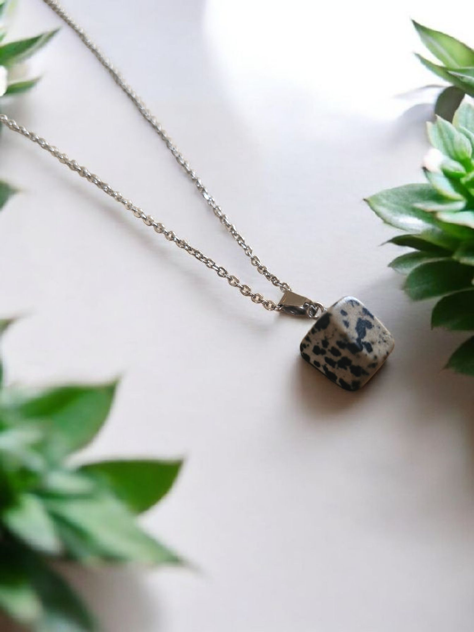 Ce collier met en avant un élégant pendentif en Jaspe Dalmatien, pierre de joie et de protection, monté sur une chaîne en acier inoxydable solide et éclatante. Son aspect moucheté unique lui confère un style original et authentique.