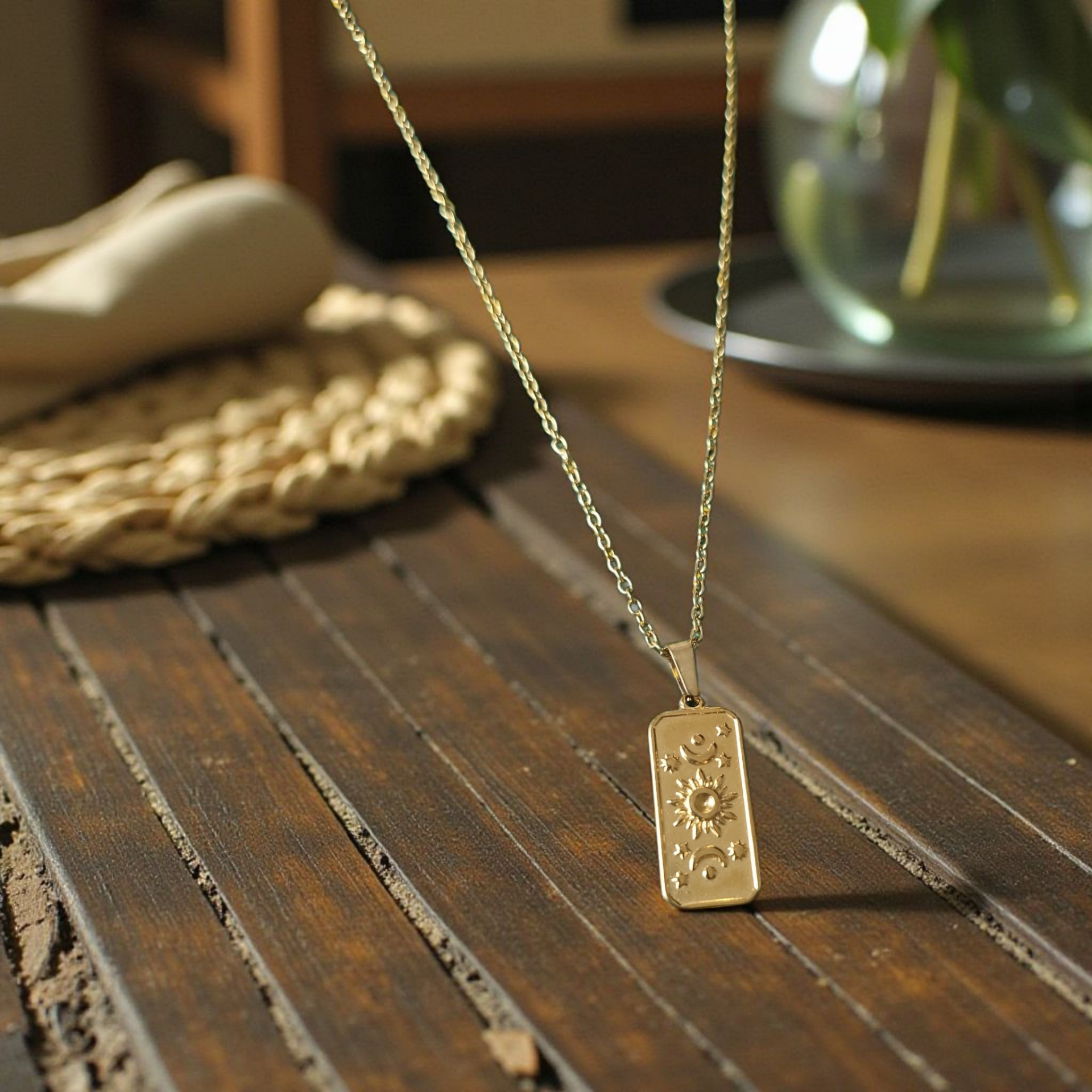Collier en acier inoxydable – Soleil doré rectangulaire