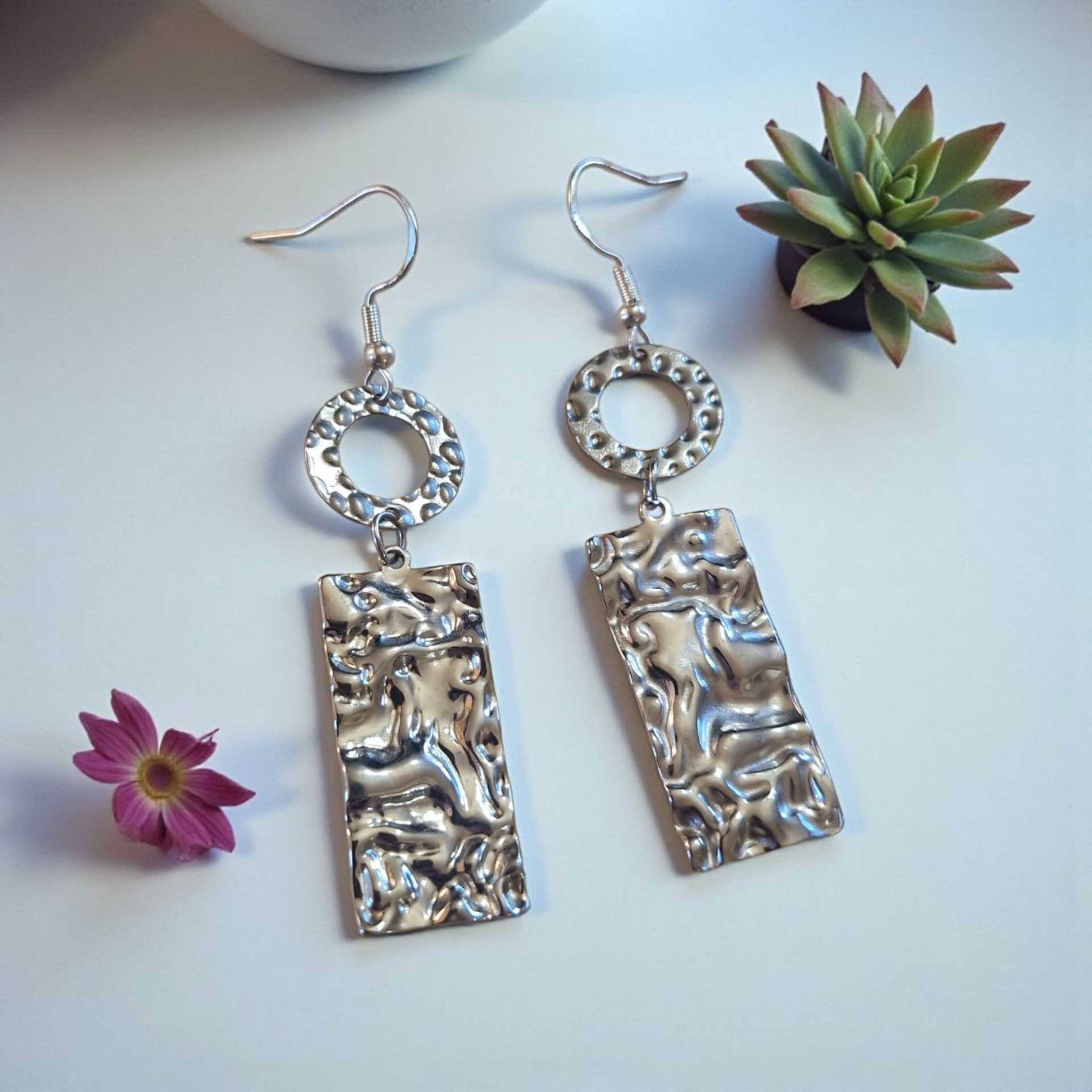 Optez pour un style moderne et audacieux avec ces boucles d’oreilles rectangulaires au design martelé et lumineux.