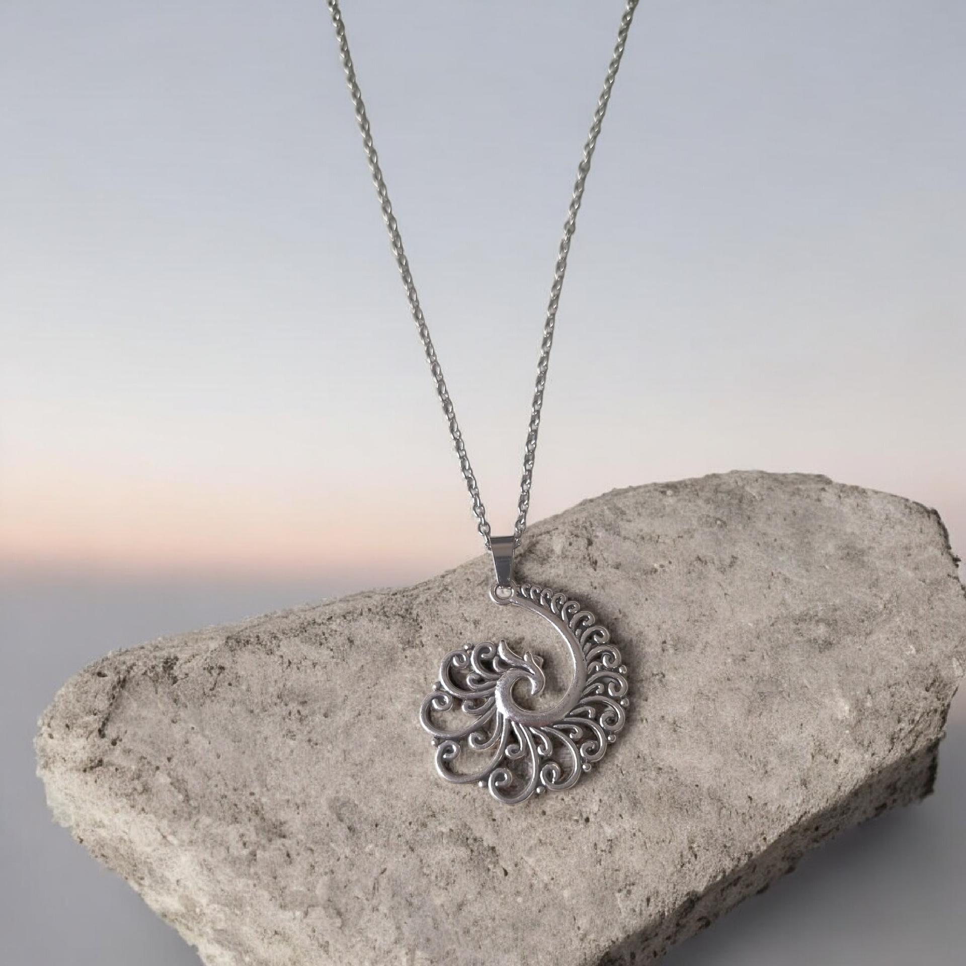 Collier en acier inoxydable argenté avec pendentif en forme de spirale ajourée à motif décoratif. Le design travaillé apporte un rendu détaillé et équilibré.