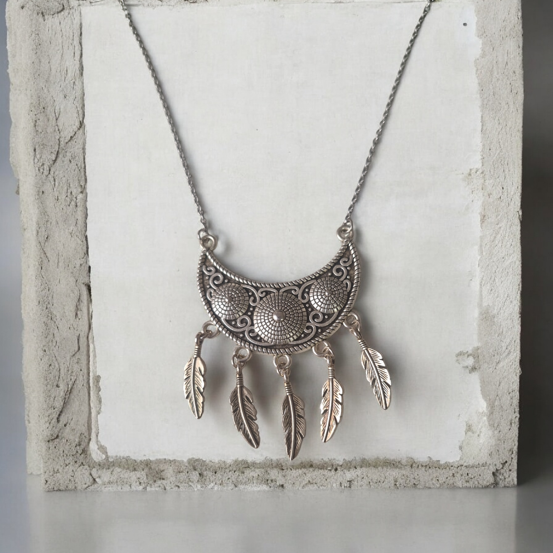 Collier en acier inoxydable argenté avec pendentif en forme de demi-lune décorée de motifs gravés et de pampilles plumes suspendues. L’ensemble forme un bijou structuré et équilibré.