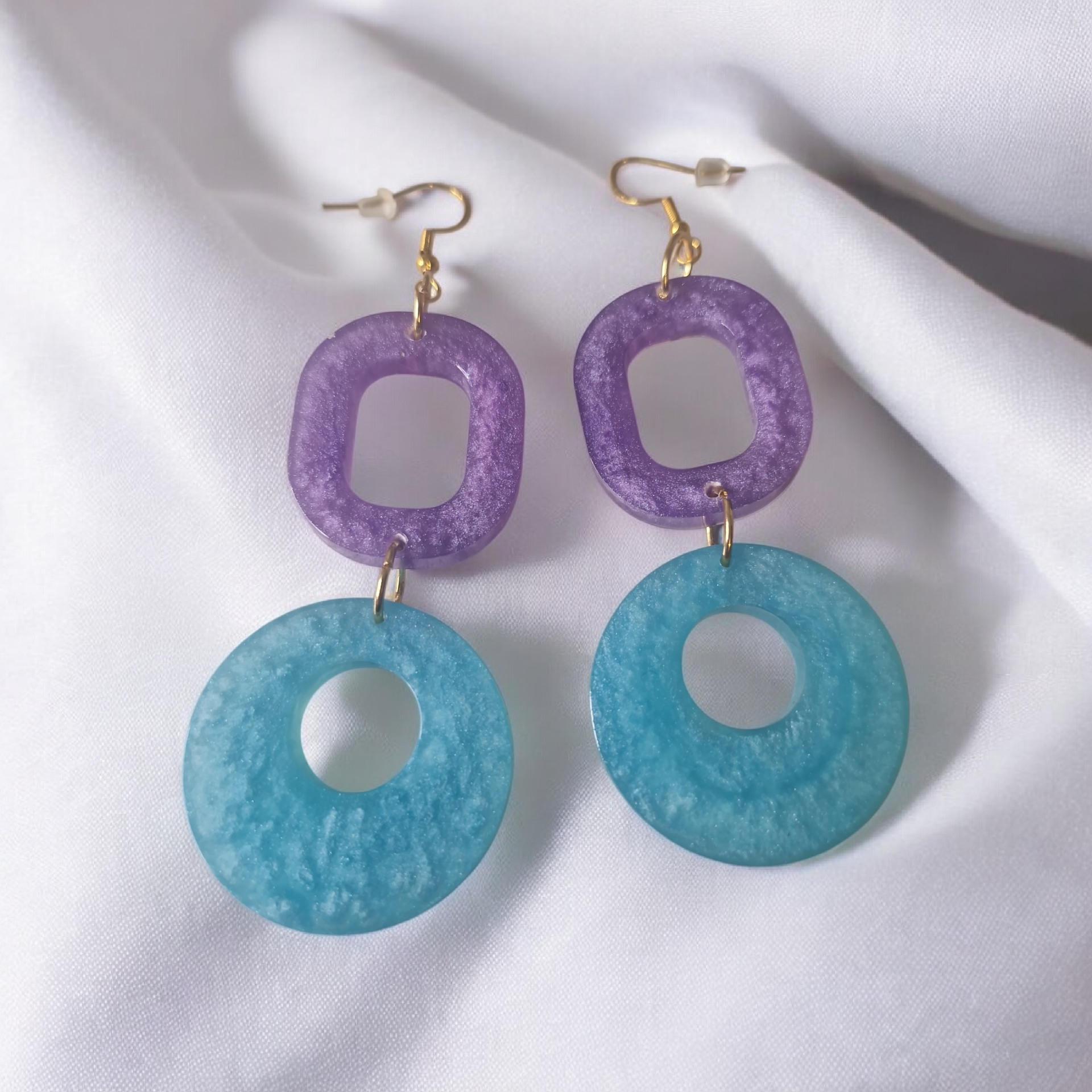 Boucles d’oreilles pendantes composées de deux formes géométriques évidées en résine époxy :