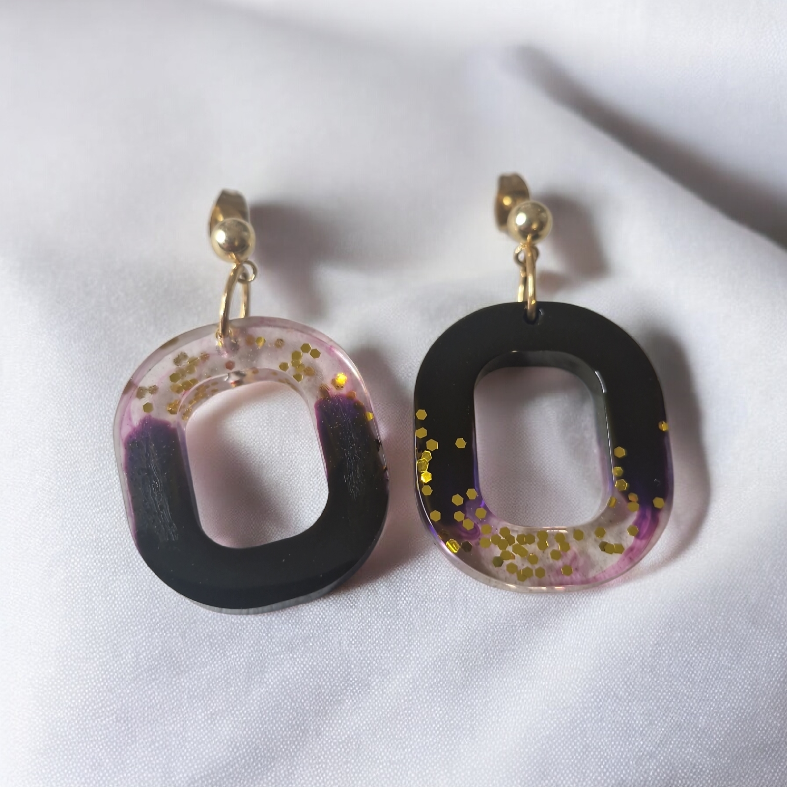 Boucles d’oreilles pendantes composées de formes carrées arrondies en résine époxy, associant un noir intense, des nuances de violet profond et des paillettes dorées incrustées.