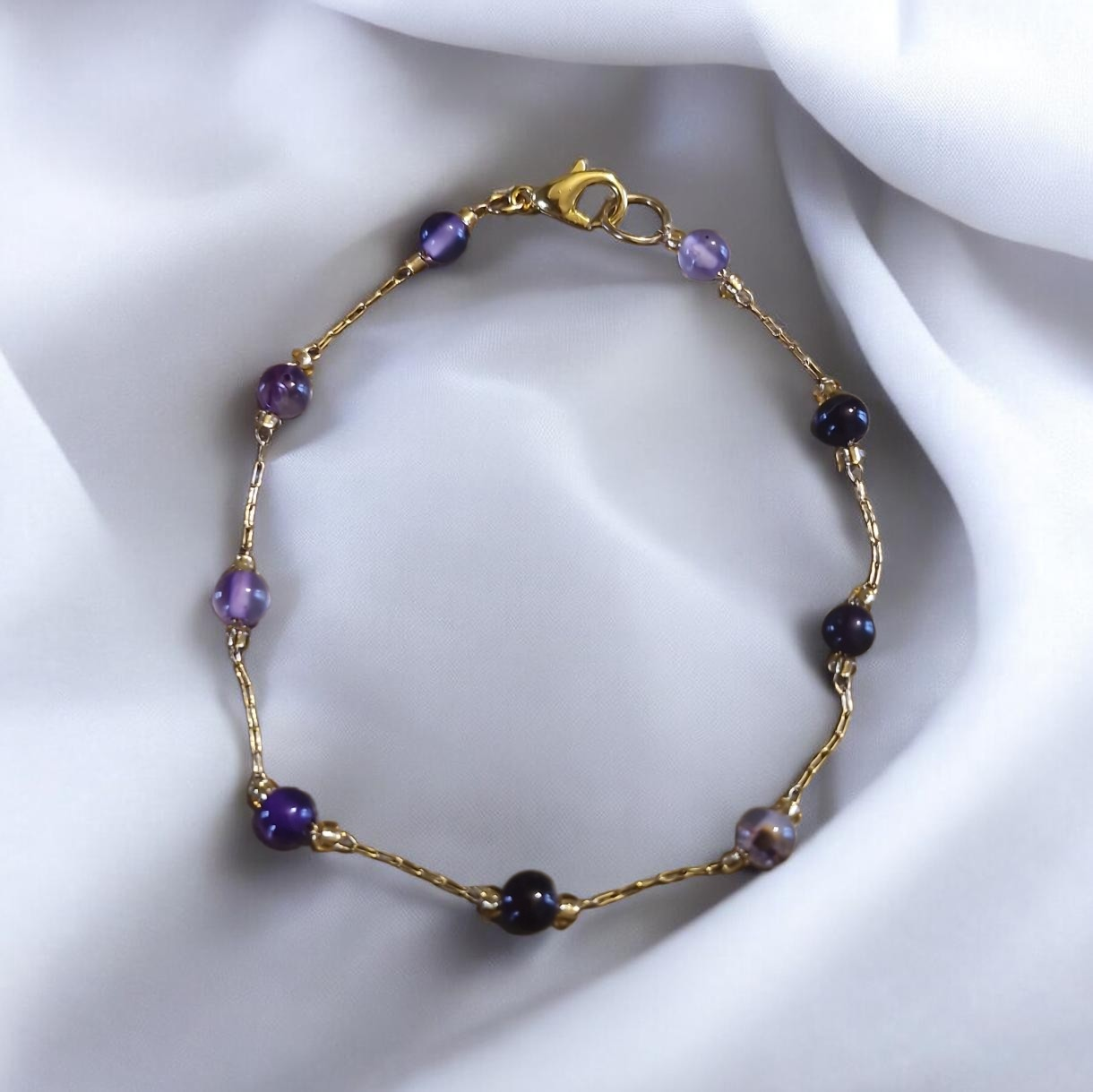 Ce bracelet en acier inoxydable doré est orné de perles fantaisie aux nuances violettes. Son design fin et élégant apporte une touche douce et raffinée à votre poignet.