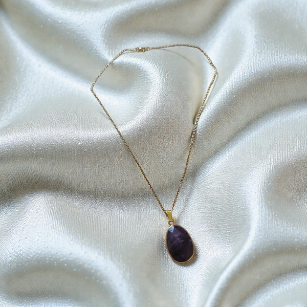 Son sertissage doré met en valeur les nuances violettes naturelles de la pierre, tandis que la chaîne en acier inoxydable doré assure durabilité et éclat au quotidien.