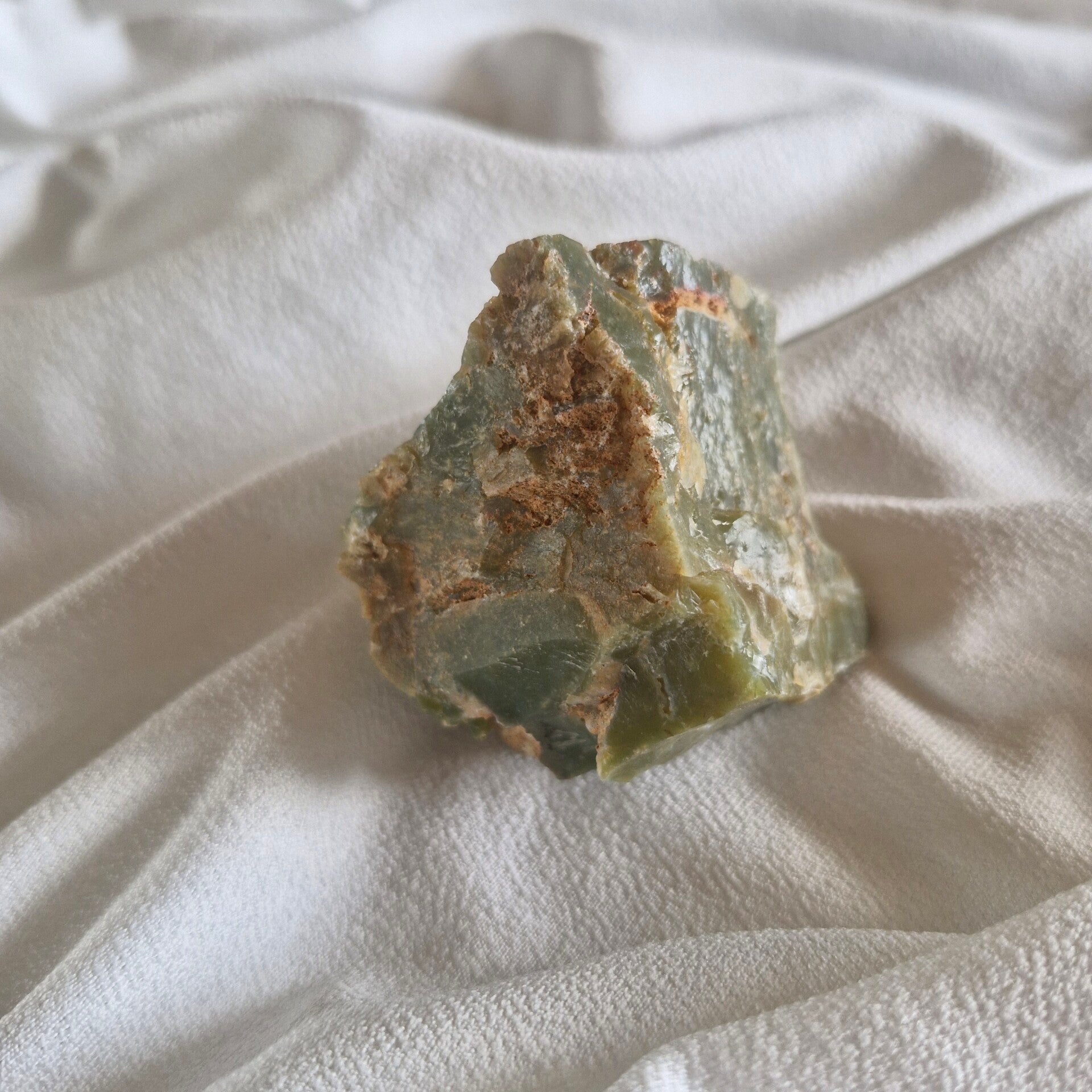 Cette opale verte naturelle dévoile de magnifiques nuances allant du vert tendre au vert olive, avec des zones légèrement translucides qui révèlent toute la richesse de ce minéral.